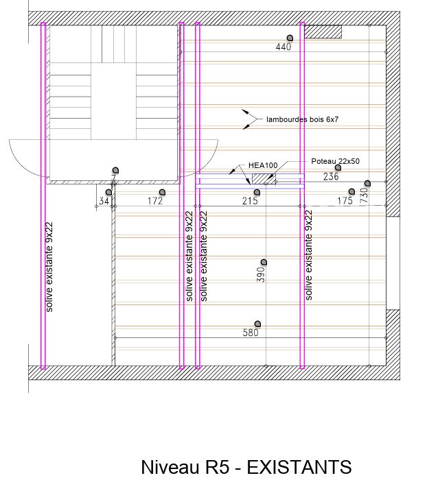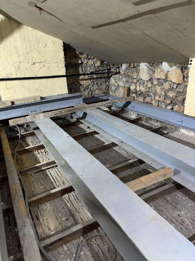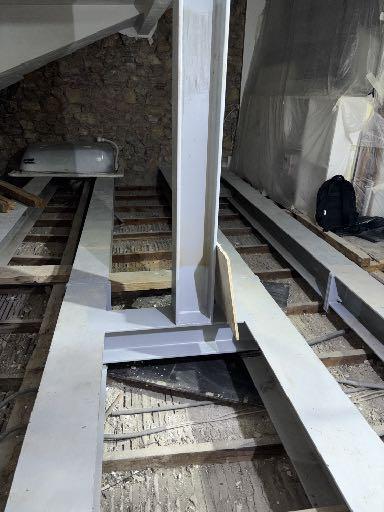 Le diagnostic a mis en évidence la nécessité de renforcer le plancher existant composé de solives bois. La solution retenue repose sur la mise en œuvre d’une ossature métallique, dimensionnée pour reprendre les charges permanentes et d’exploitation sans dépose lourde du plancher.