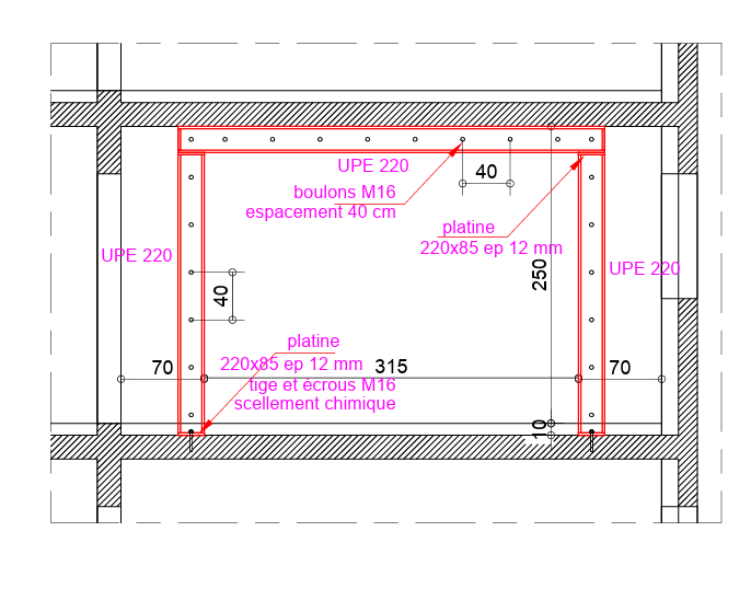 Selon la composition du mur porteur, la société exécutante a réalisé des sommiers en béton armé ou en mortier à retrait compensé. Ces sommiers ont servi de base solide pour soutenir les profilés métalliques, garantissant ainsi une assise stable et durable.